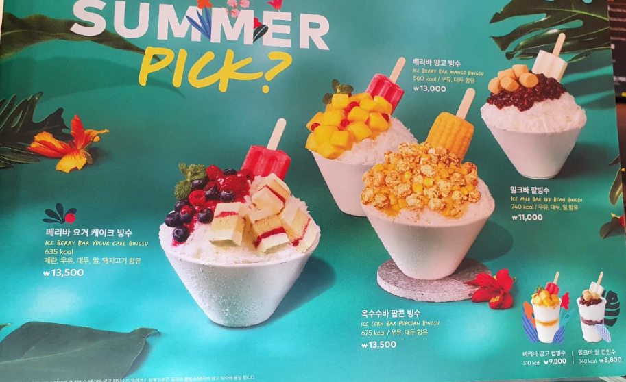 벌써 여름 음식인 팥빙수가 나왔네요.베리바 요거 케이크 빙수, 옥수수바 팝콘 빙수, 밀크바 팥빙수, 베리바 망고 빙수 등 가격은 11000원에서 13500원으로 생각보다 비싼 것 같네요.