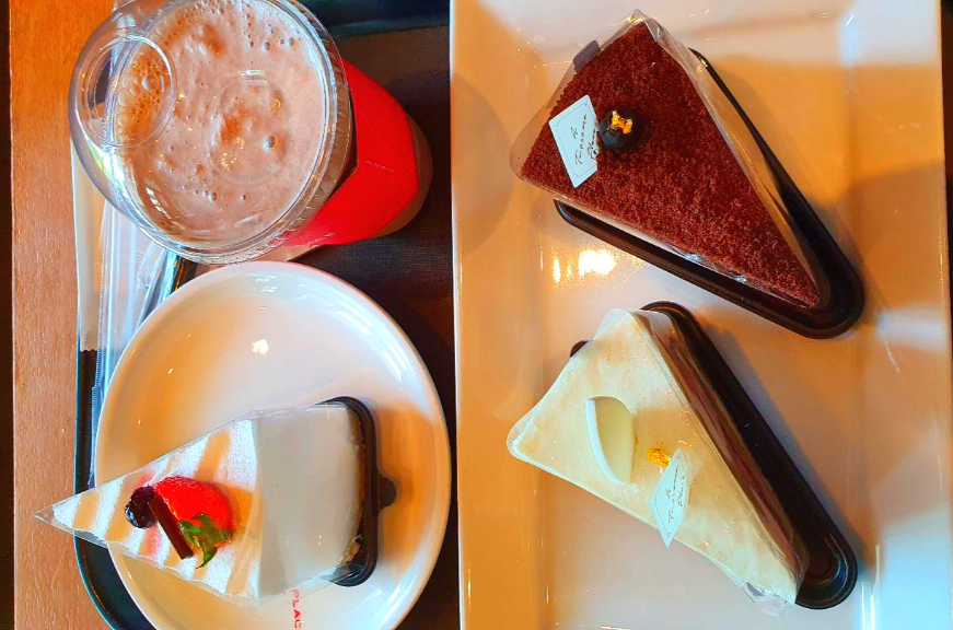 오늘은 음료 한잔만 시키고 조각 케이크들을 종류별로 주문했습니다.