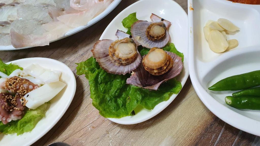 개불, 전복, 해삼, 오징어, 멍게. 조개 관자까지 나오는데 조개 관자는 조개 살과는 또다른 식감이 있어 먹는 재미도 느꼈네요.