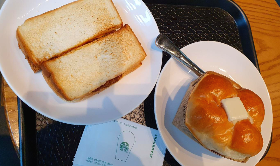 얼마전까지만 해도 오전에 가면 사람이 적었는데 오늘은 오전인데도 스타벅스에 사람들이 많아 오래 앉아 있지는 못하고 잠시 차랑 빵만 먹고 왔습니다.