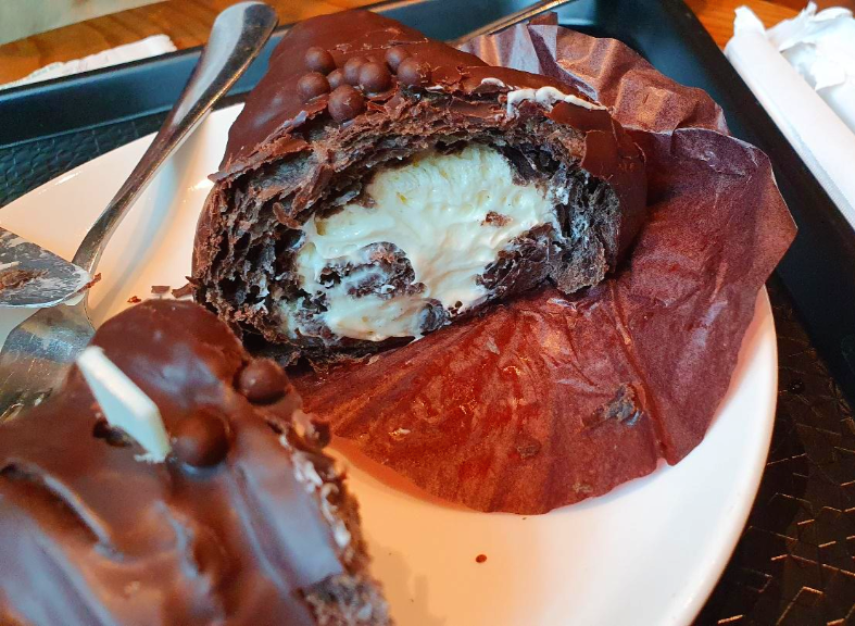 두툼한 초코 코팅을 반으로 잘라보니 고소한 우유 생크림이 가득들었고 초코 코팅위에는 초코볼이 콕콕박혀 먹음직스럽게 보이네요.
