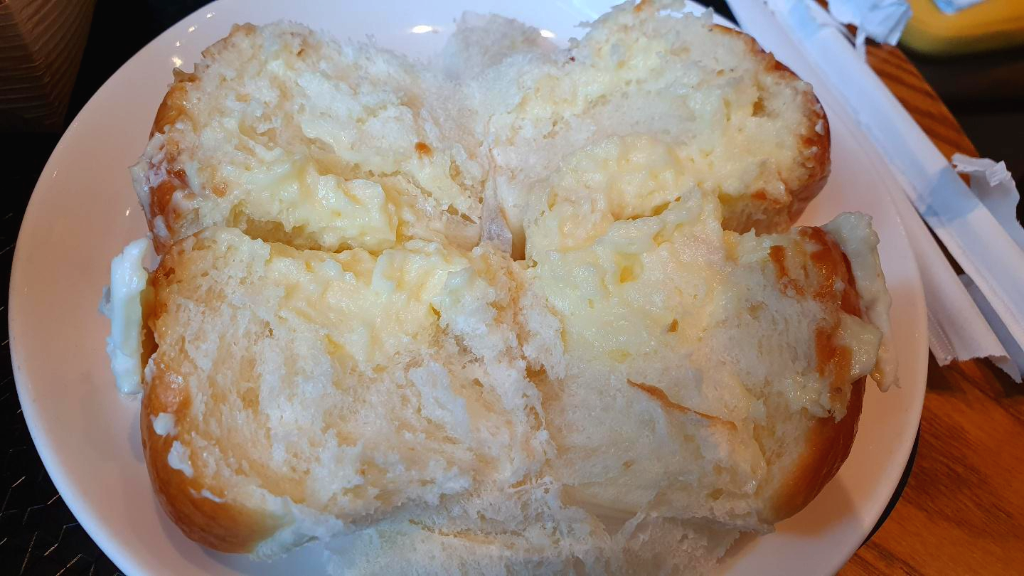 부드러운 빵 안에 연유 버터크림이 들어있고 위에는 버터가 장식되어 있어요.