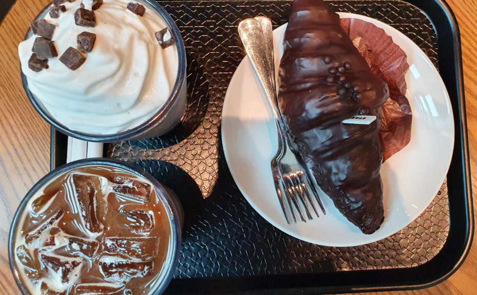 스타벅스 돌체라데랑 민트초콜릿 칩 블렌디드, 우유 초콜릿 크루아상이 나왔습니다.