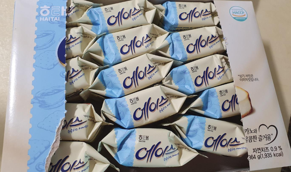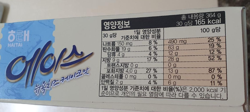 해태제과 신상 뉴욕치주케이크맛 에이스 총내용량은 364g 1935kcal(30g당 165kcal)입니다.