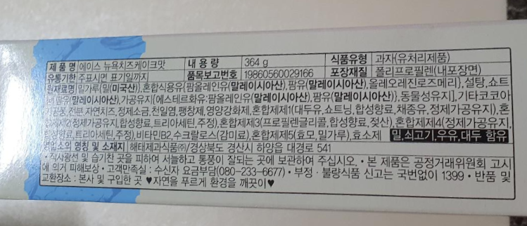 뉴욕치즈케이크맛 에이스는 자연치즈가 0.9% 들어있어 치즈케이크 맛처럼 강하지는 않지만 치즈맛은 나는것 같아요.