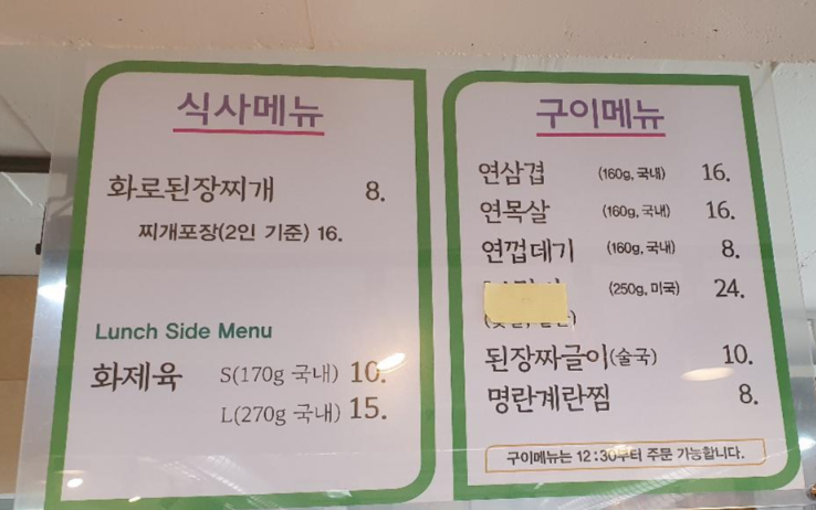 식사메뉴와 구이메뉴가 있었는데 점심시간이라 사람들이 대부분 화로 된장찌개와 제육볶음을 주문했습니다.
