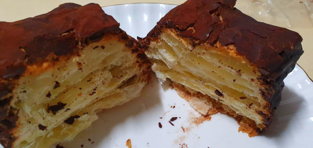 더블초코를 반을 잘랐더니 겹겹이 초코 퐁당처럼 초코가 들어있지 않고 겹겹이 쌓인 패스츄리 주위를 진한 초코를 발랐어요.