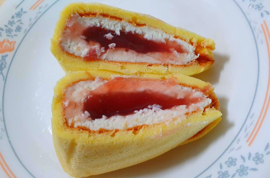 얇은 카스테라 속에 딸기필링을 생크림으로 둘러싸여져 있습니다.