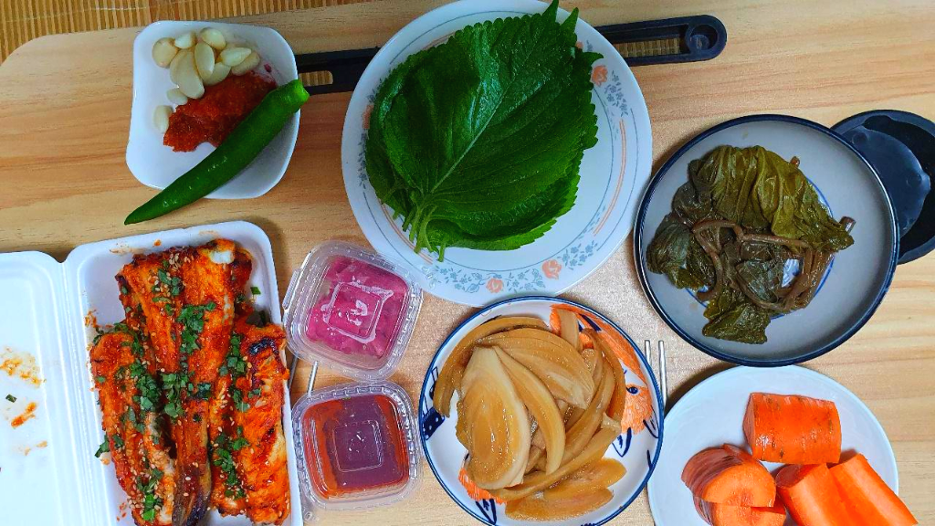 깻잎한 장에 장어구이 한 점, 마늘 한 쪽, 생강절임, 양파장아찌를 올려 한 쌈 가득 사서 먹으면 맛이 없을 수가 없죠.