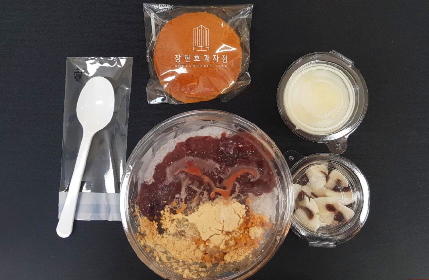 장현호 과자점 팥빙수는 얼음에 팥과 인절미 가루가 다로 포장되어 있고 참쌀떡은 먹기좋게 잘려져 있고