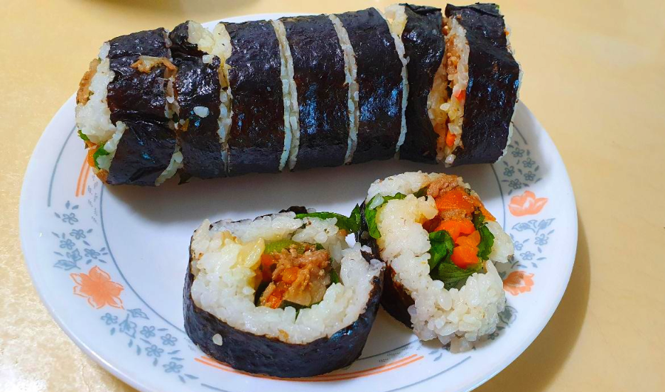 바싹불고기쌈 김밥 속에는 당근, 깻잎, 상추, 돼지 뒷다리살로 만든 불고기가 들어있어요.