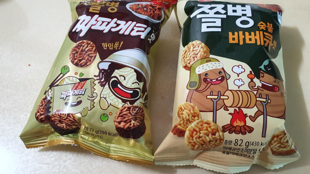오늘은 쫄병스낵 짜파게티맛이랑 숯불바베큐 맛을 먹어 보았는데요