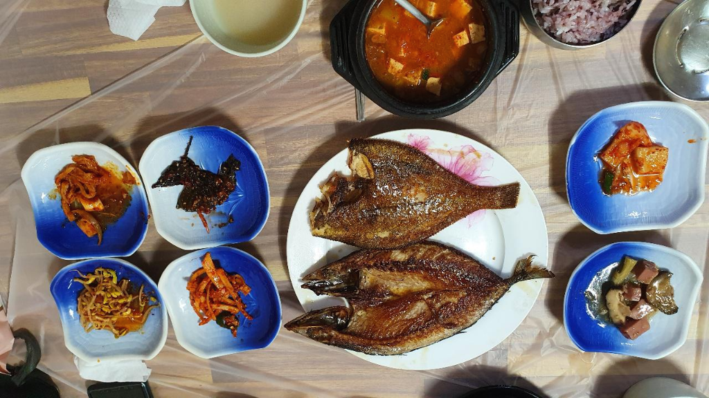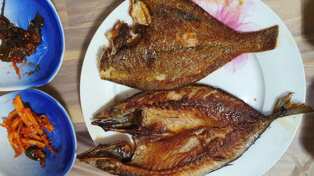 된장찌개랑 밥을 맛있게 먹고 있으니 노릇노릇 맛있게 구워진 생선구이(고등어, 납세미)가 나와 보기만해도 먹음직스러웠습니다.