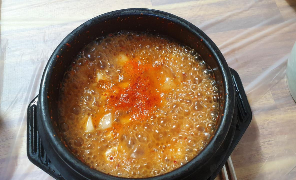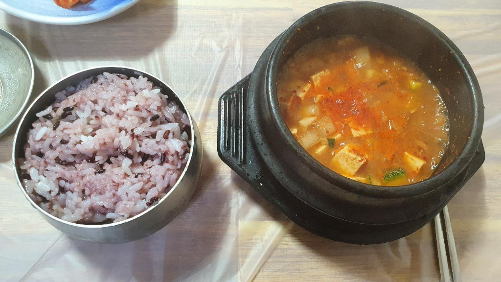 밥도 후한 인심을 자랑하듯 두둑하게 담아 주셨고 보글보글 된장찌개도 1인 1개가 나왔는데 단백하면서