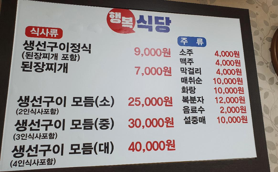 행복식당은 생선구이 전문점이라 메뉴는 생선구이랑 생선구이 정식(된장찌개 포함), 된장찌개로 심플합니다.