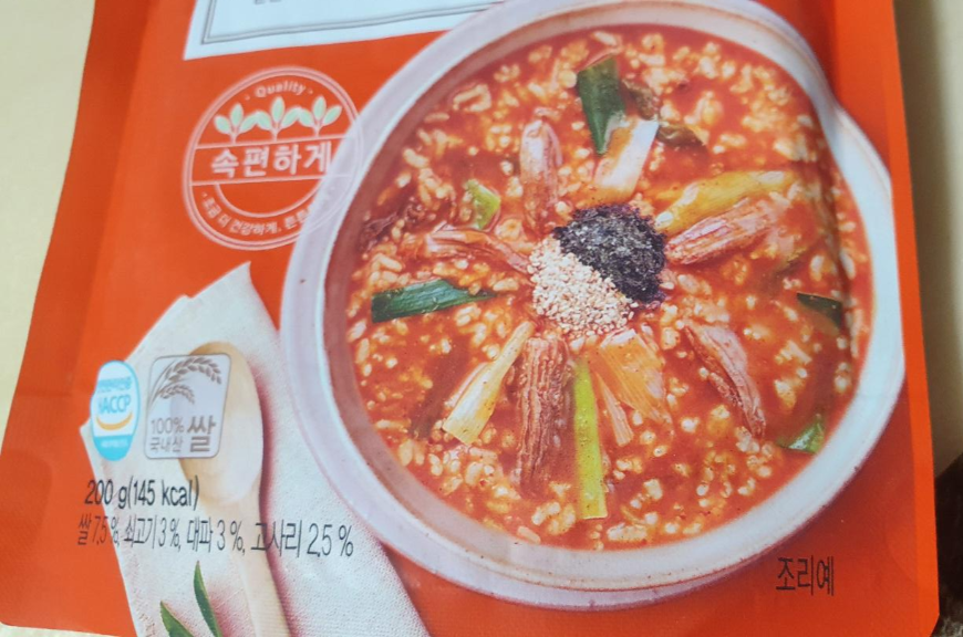 얼큰육개장 죽은 총내용량 200g에 145kcal입니다,