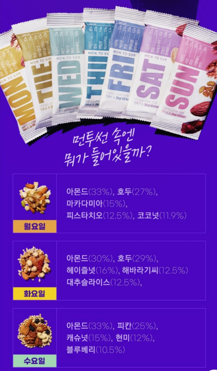먼투썬은 요일별로 조금씩 다른 맛으로 되어있어 먹는 재미도 솔솔 하고 소포장이라 가지고 다니기도