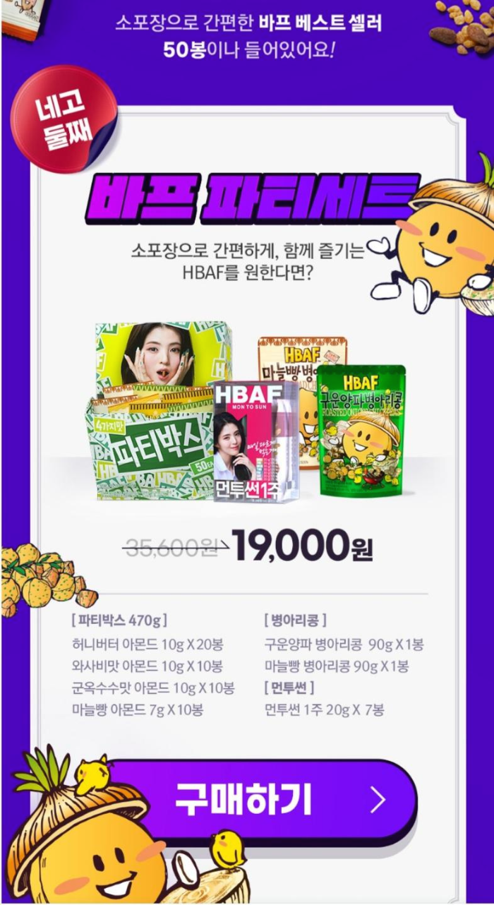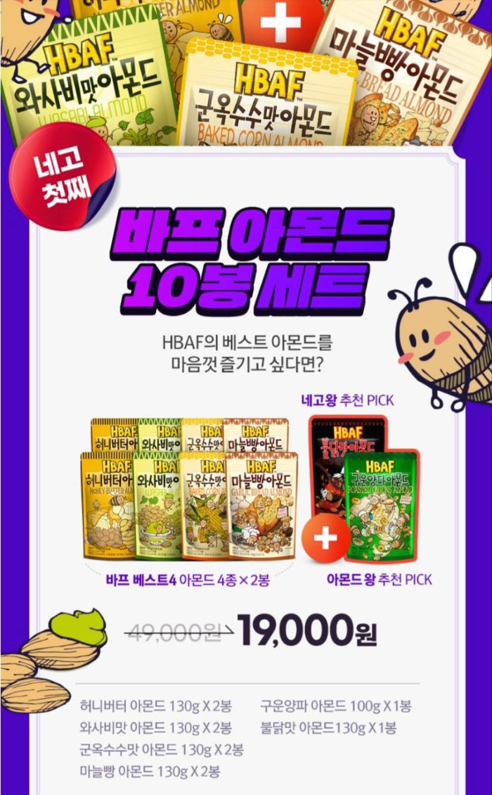 바프 베스트 아몬드 4종(허니버터, 와사비, 군옥수수, 마늘빵 +네고왕 추천 PICK 1종(붉닭 맛)+
