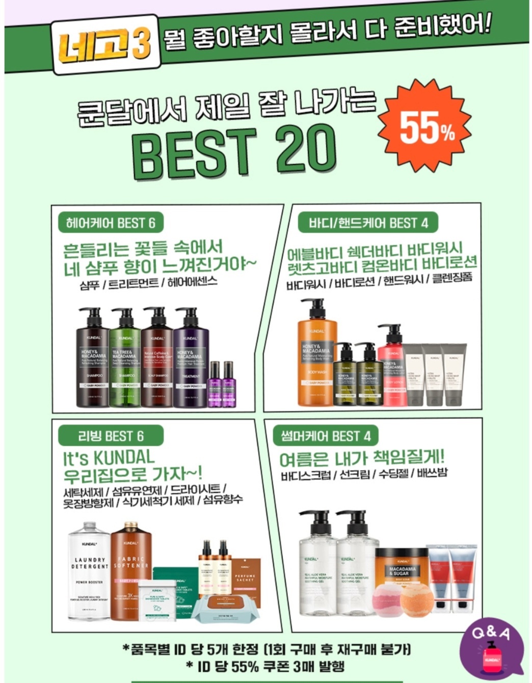 3.쿤달에서 제일 잘나가는 베스트 품목 20가지 55% (품목별 ID당 5개 한정,ID당 55% 쿠폰 3매 발행)