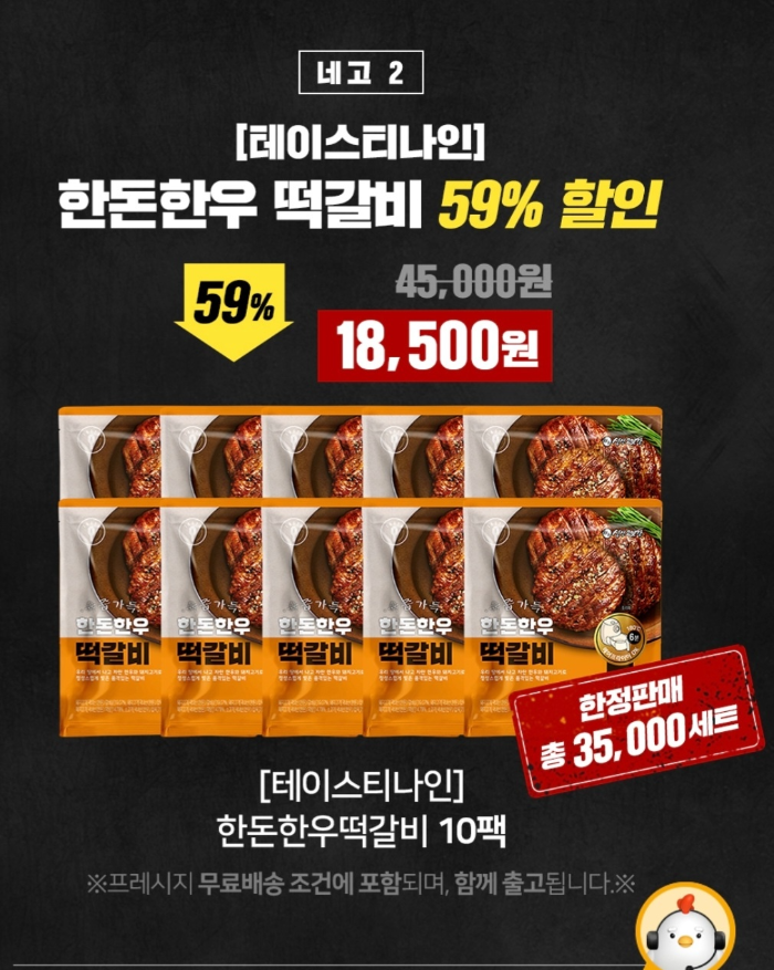2. 테이스티나인 한돈 한우 떡갈비 10개 세트 59% 할인된 18500원(한정판매 총 35000세트)