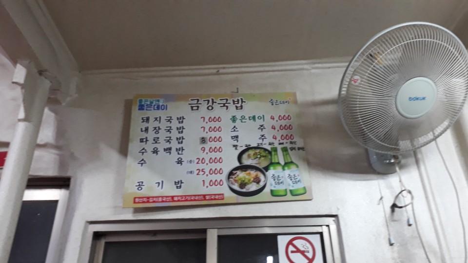 30년 전통의 금강국밥이라 적힌 허름한 국밥집이었어요. 좀 늦은 시간이라 끝났나 싶었는데 다행히 손님 한 팀이 계셔서 저희를 마지막 손님으로 받아주셨어요. 하지만 아쉽게도 다른 건 못 고르고 돼지국밥만 된다고 하시더라고요.