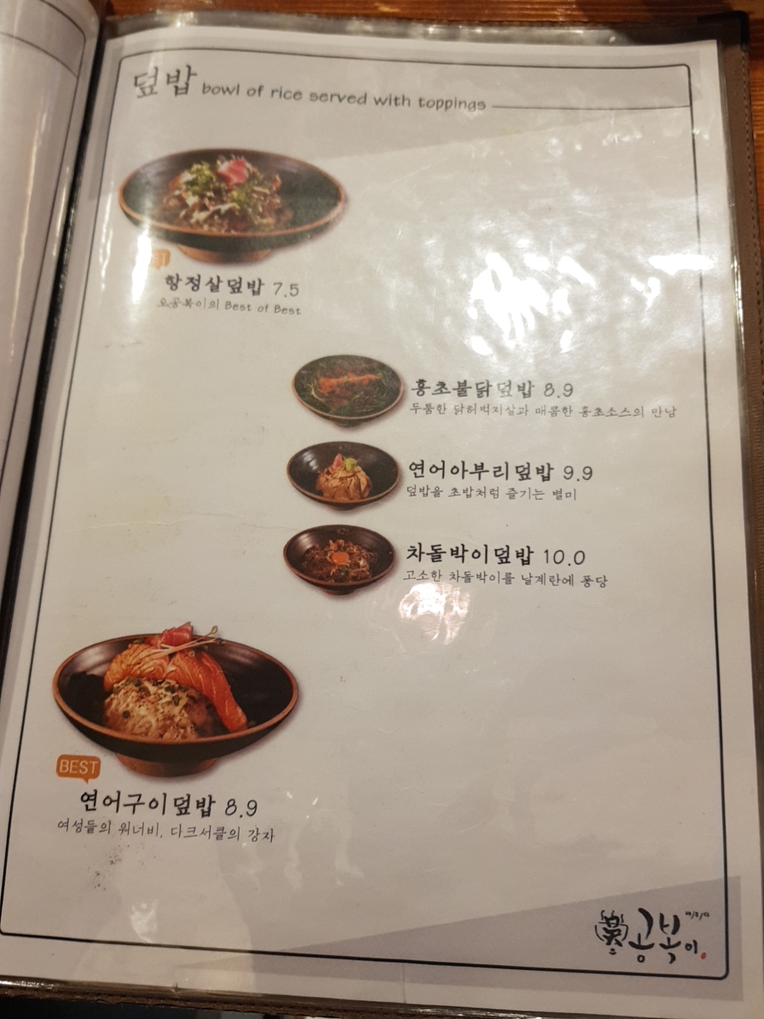 이렇게 가장 잘나가는 메뉴판을 따로 주시니, 고르는데 덜 힘들었던 것 같아요! 저희는 항정살 덮밥이랑 스테이크 덮밥을 주문했어요.