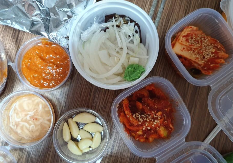 내사랑 족발집은 보쌈김치, 양파간장절임, 무우말랭이, 겉저리, 마늘, 쌈장, 상추, 막국수, 계란찜등 포장해서 와도 서비스는 푸짐하게 따라옵니다.