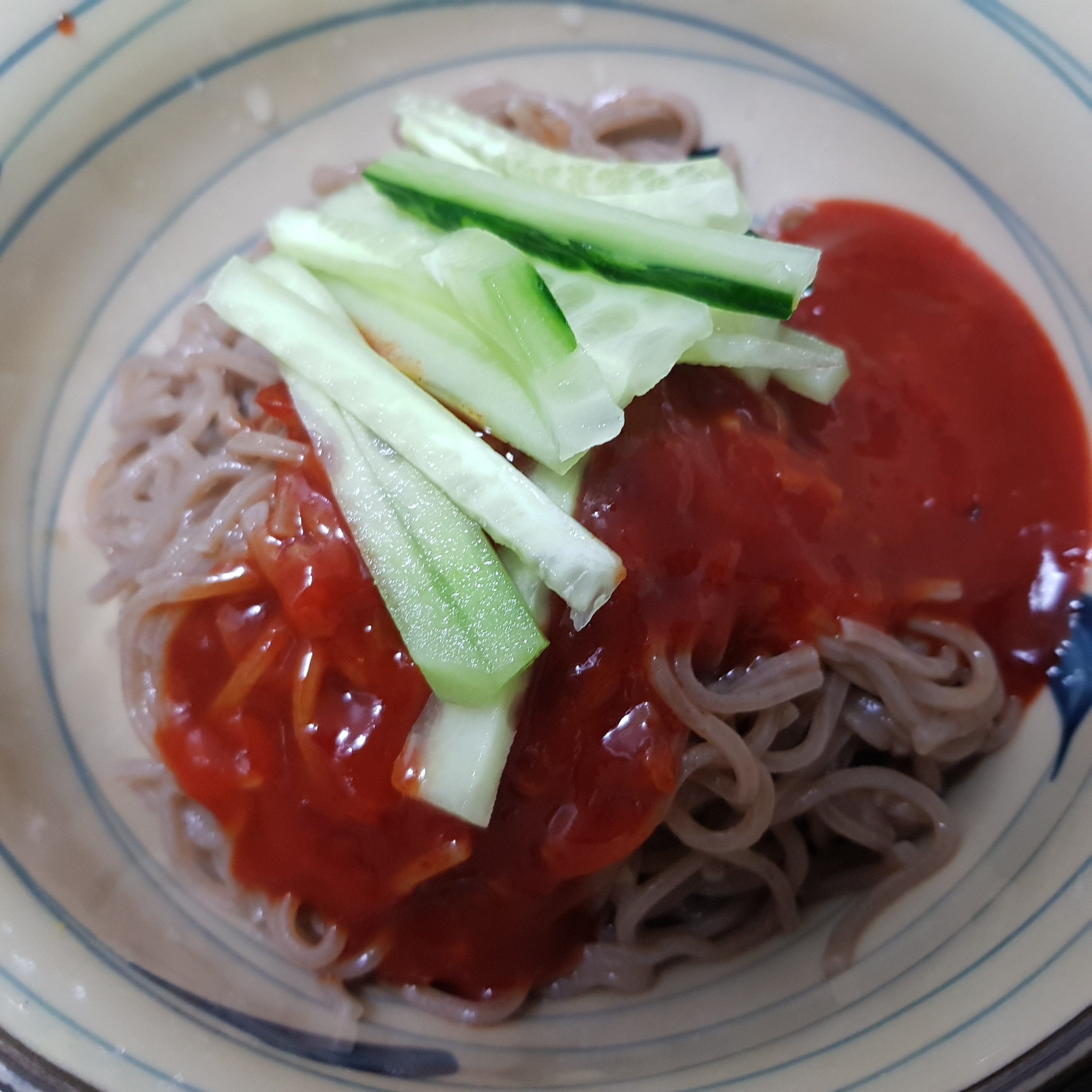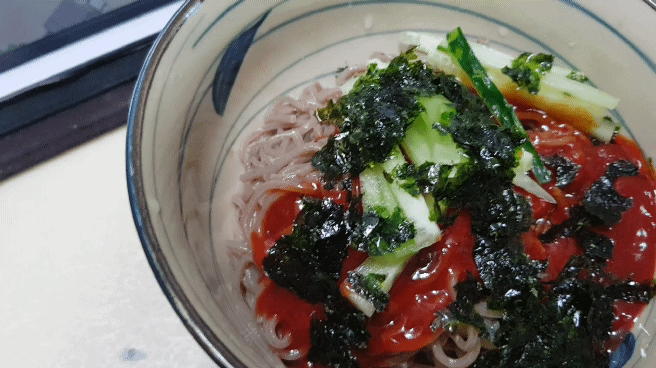이번에는 비빔막국수에요. 오이랑 김가루를 넣어 비벼 먹어봤더니 매콤달콤 맛있는 비빔막국수가 되었어요.