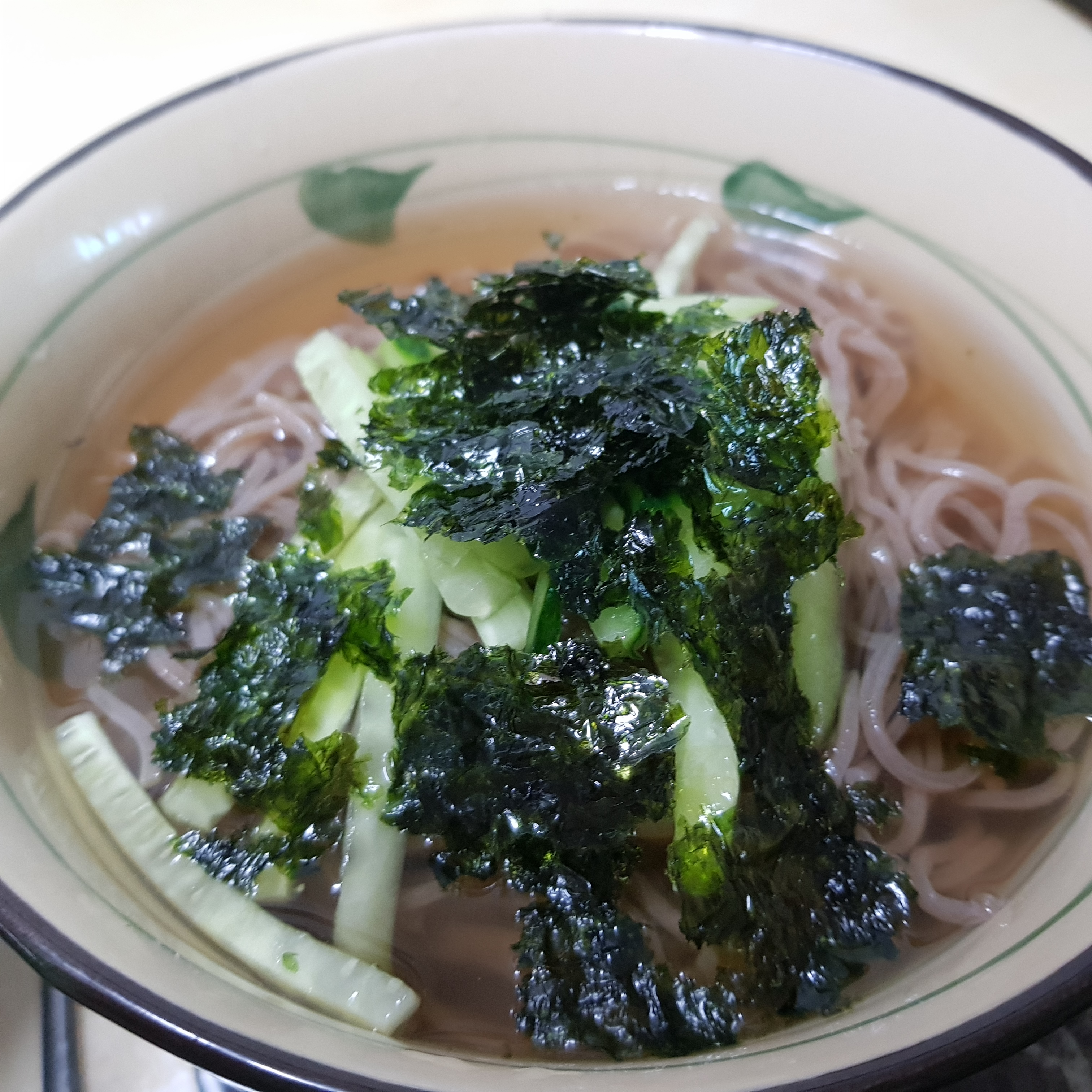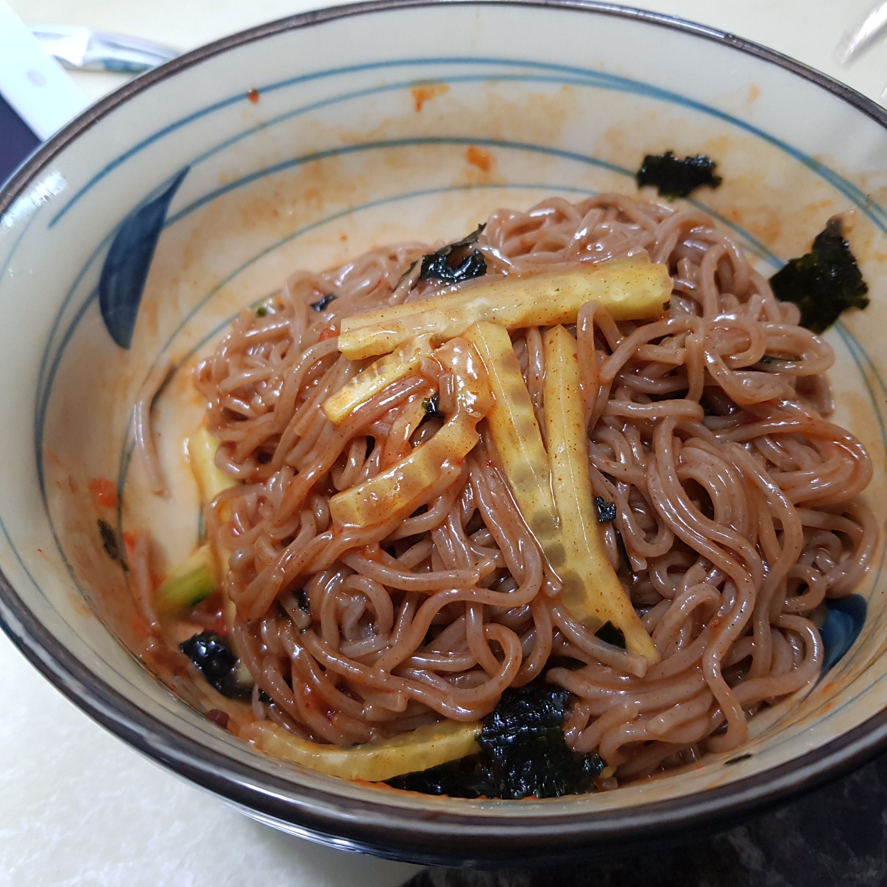 물막국수에 오이랑 김가루를 넣어 봤는데 싱거워 제 입맛에는 안맞더라구요. ㅎㅎ 여기에 양념장을 넣어드시면 될 것같아요.