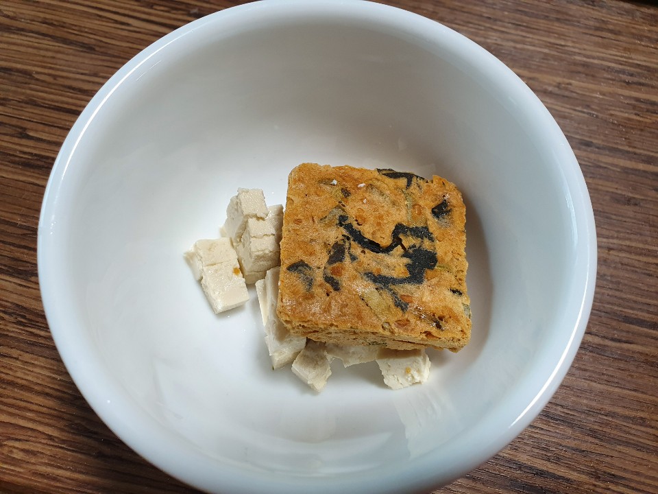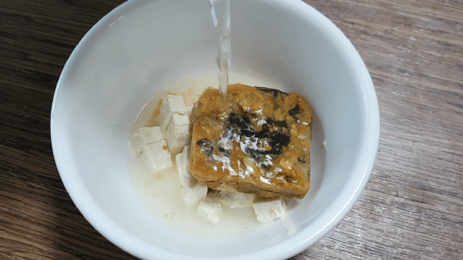 두부를 조금 잘라 넣고 홍게 블록을 하나 넣고 뜨거운물을 부었습니다.
