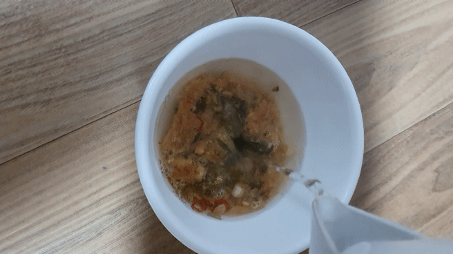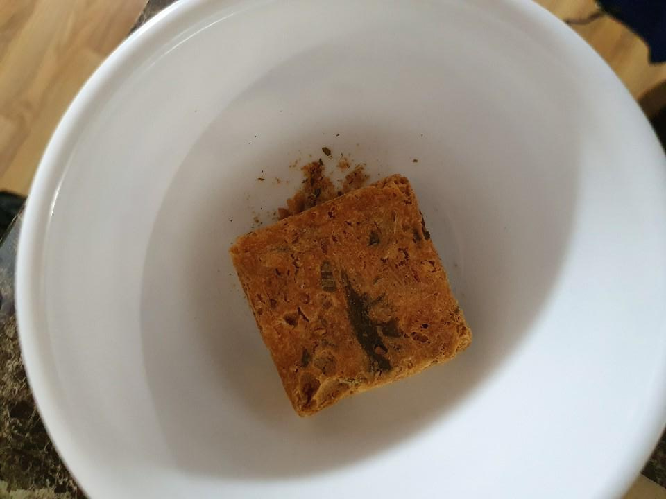 우거지 된장국 블록을 하나 넣어주고 뜨거운 물을 부어 주면서 간을 보고 조절하면 될 것 같아요.(약 물1컵)