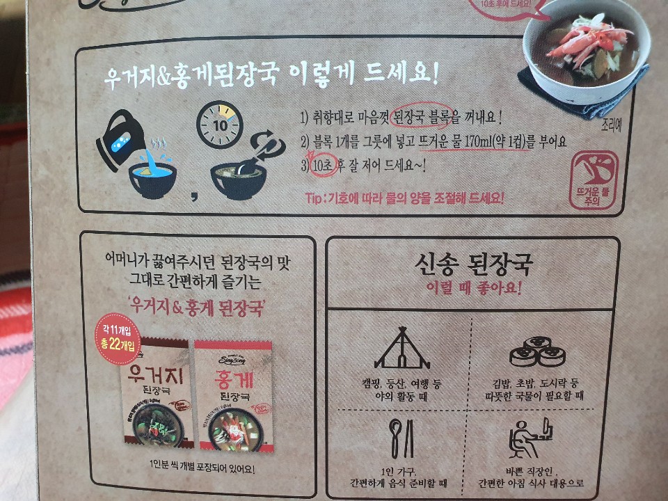즉석조리식품 홍게 된장국이 낱개로 되어 있어 참 편리합니다. 따뜻한 국물이 필요할 때 집에서도 언제던지 엄마의 손맛을 느낄 수 있는 음식입니다.